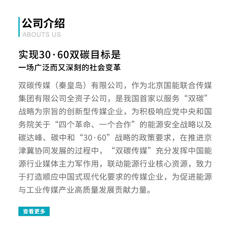 雙碳傳媒(秦皇島)有限公司,作為北京國能聯合傳媒集團有限公司全資子公司,是我國首家以服務“雙碳”戰略為宗旨的創新型傳媒企業,為積極響應黨中央和國務院關于“四個革命、一個合作”的能源安全戰略以及碳達峰、碳中和“30·60”戰略的政策要求,在推進京津冀協同發展的過程中,“雙碳傳媒”充分發揮中國能源行業媒體主力軍作用,聯動能源行業核心資源,致力于打造順應中國式現代化要求的傳媒企業,為促進能源與工業傳媒產業高質量發展貢獻力量。